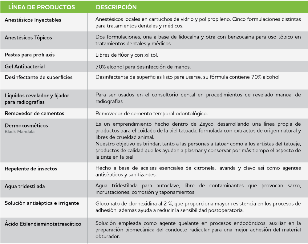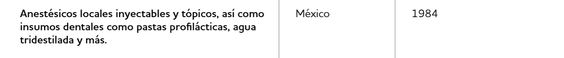Anestésicos locales inyectables y tópicos, así como insumos dentales como pastas profilácticas, agua tridestilada y más.