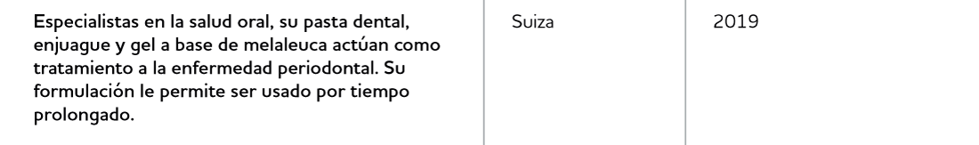 Especialistas en la salud oral, su pasta dental, enjuague y gel a base de melaleuca actúan como tratamiento a la enfermedad periodontal. Su formulación le permite ser usado por tiempo prolongado.