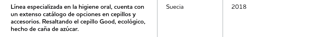 Línea especializada en la higiene oral, cuenta con un extenso catálogo de opciones en cepillos y accesorios. Resaltando el cepillo Good, ecológico, hecho de caña de azúcar.