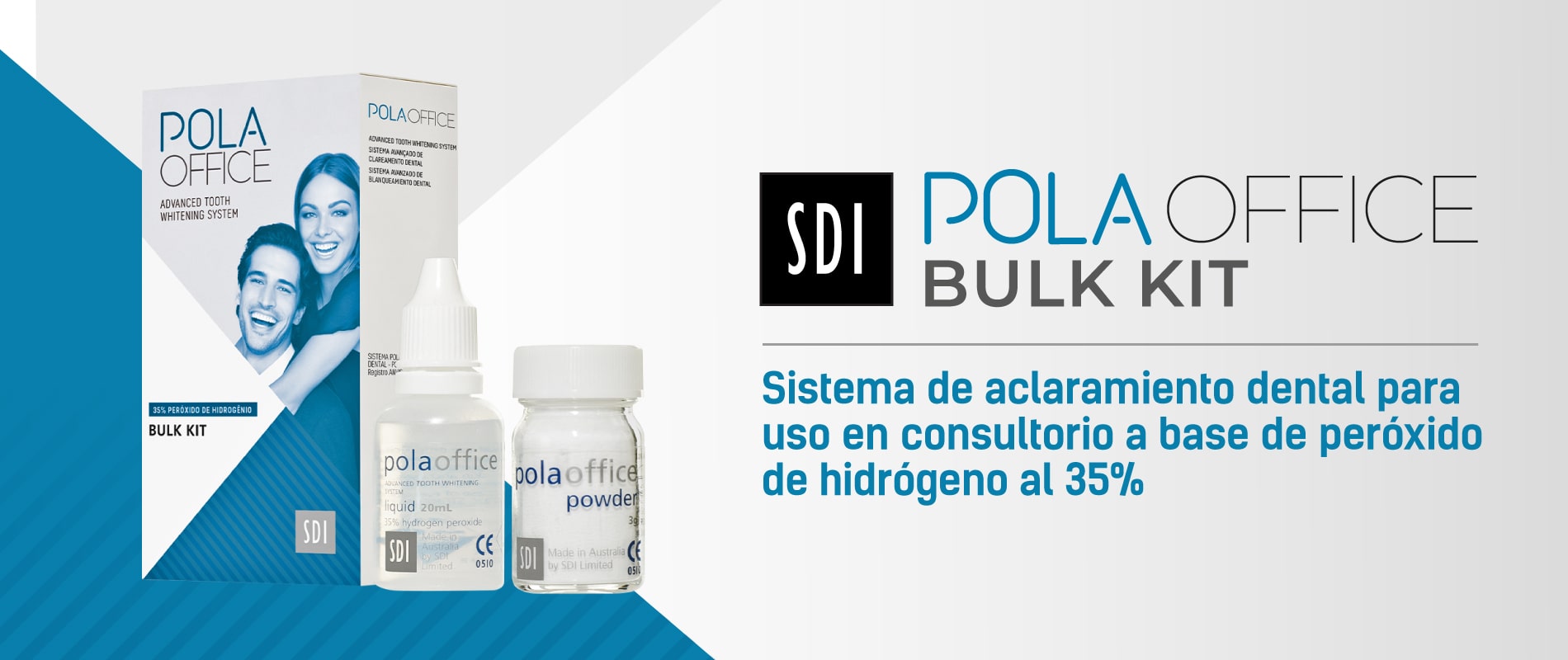 Presentación: 1 frasco de pola office en polvo de 3 g, 1 botella de pola office en líquido de 20 ml, 3 jeringas de barrera gingival de 1 g y accesorios.