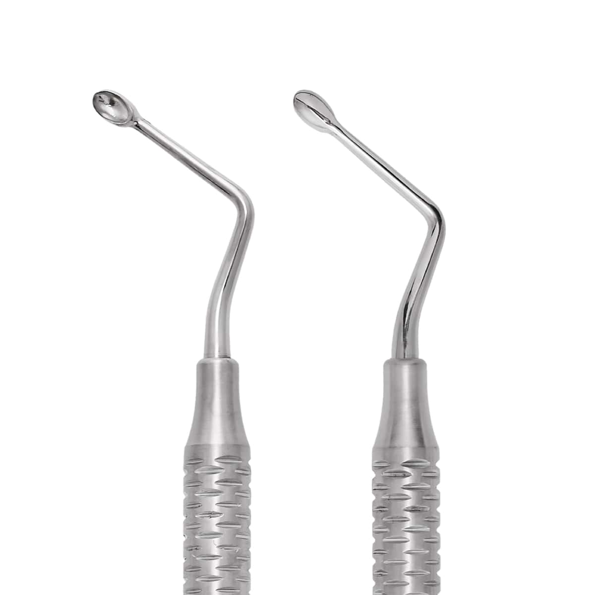 Los dos extremos ovalados activos de la cureta alveolar Hemingway de MEDESY están acabadas con el máximo cuidado. Los bordes debidamente afilados permiten raspar perfectamente la fosa alveolar para eliminar con eficacia gránulos y quistes.