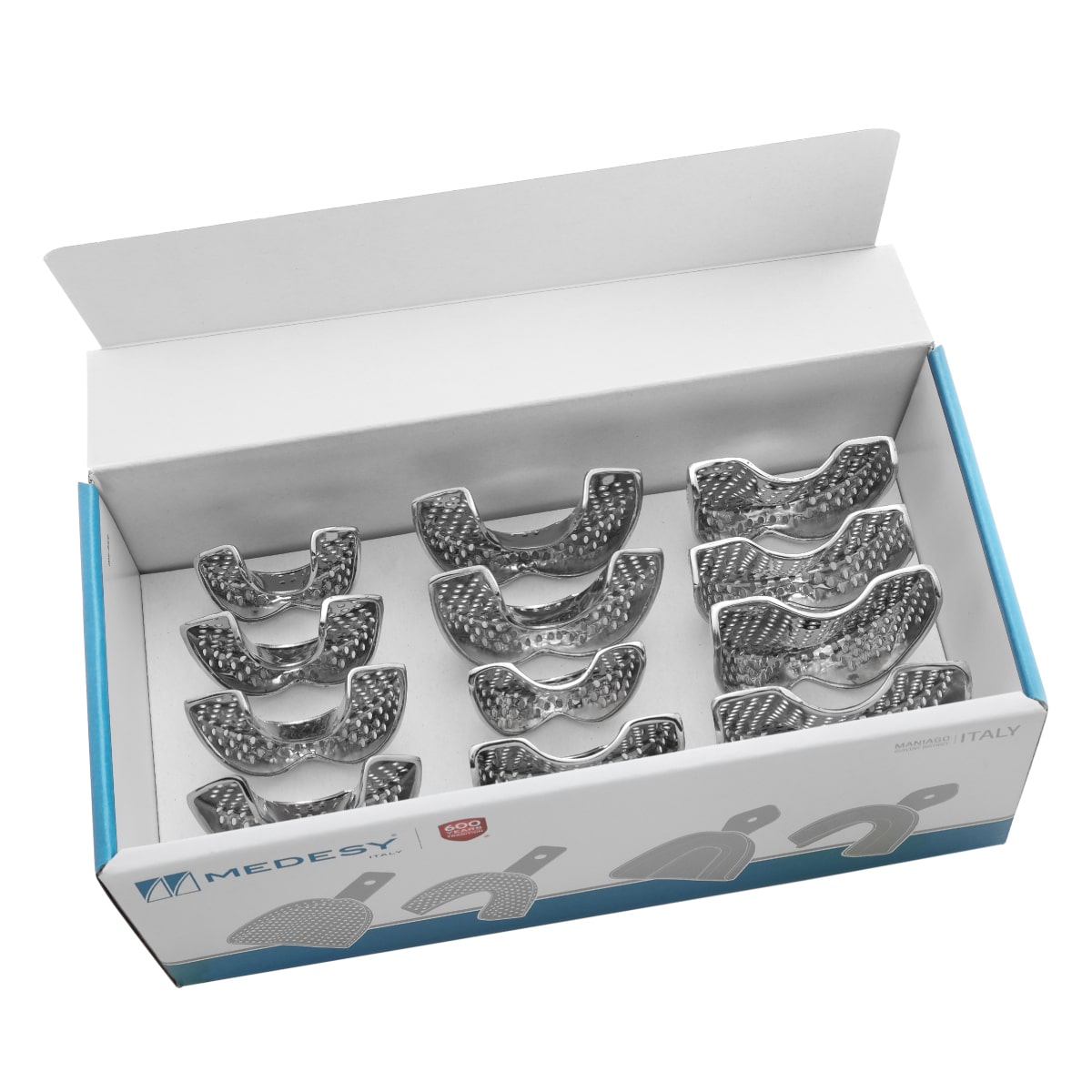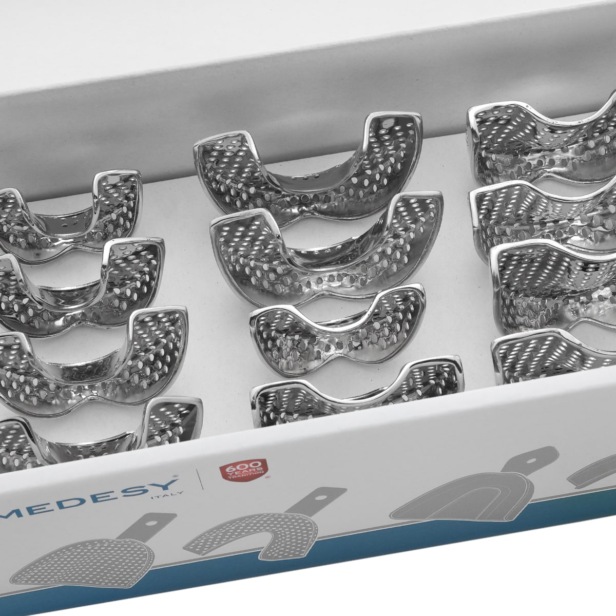 Portaimpresiones con orificios y bordes de retención ofrecen un agarre muy eficaz y preciso gracias a la elevada retención mecánica al material de impresión garantizada tanto por los orificios como los bordes.