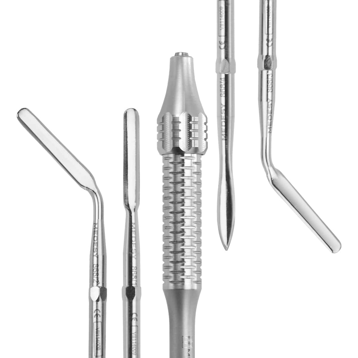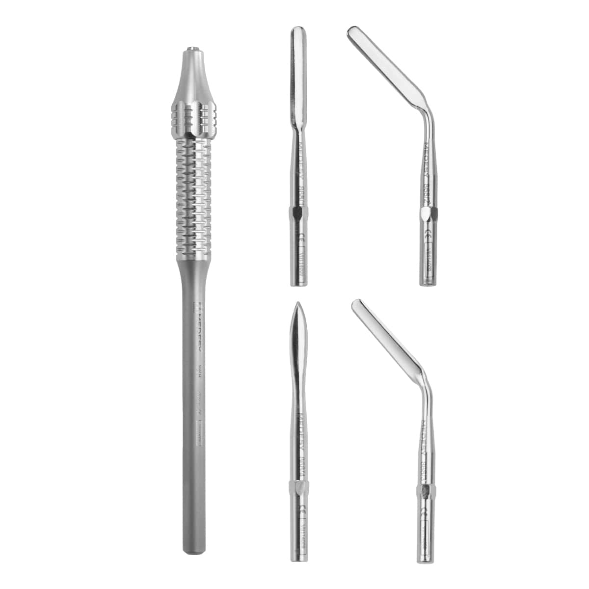 El kit de periotomo de MEDESY es un instrumento completo y eficaz. Está compuesto por un mango con 4 hojas distintas intercambiables, eficazmente afiladas pero al mismo tiempo delicadas, para lograr el corte de la encía y del ligamento periodontal, además de para garantizar una extracción atraumática del diente sin comprometer ni dañar la fosa alveolar circundante.