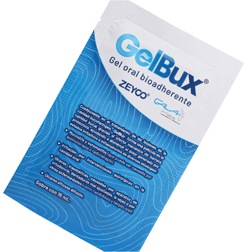 GelBux® tiene propiedades lubricantes y humectantes, ya que contiene hialuronato de sodio. Su formulación, con pH compatible con el equilibrio natural de la mucosa oral, ayuda a la restauración de los tejidos por su contenido de ácido glicirretínico. En conjunto, estos componentes actúan como coadyuvantes en el tratamiento de la xerostomía y ayudan a aliviar las molestias asociadas a la baja o nula salivación.