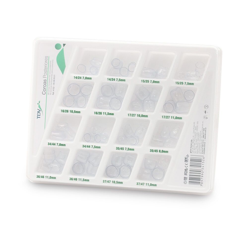 Las coronas transparentes TDV son producidas para dientes permanentes y pediátricos; en los casos de dientes anteriores se ofrecen en 3 tamaños diferentes y para los posteriores en 2. El material utilizado es transparente y no reacciona químicamente con ningún tipo de resina de uso odontológico; lo que asegura su anti-adherencia.