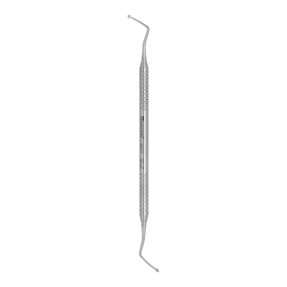 El explorador endodóntico con doble punta de Medesy viene con un mango de acero inoxidable Dalila de 6 mm de diámetro, poco voluminoso y muy manejable. Las puntas están anguladas y las hay de distintas dimensiones. Pueden ser redondas u ovaladas según la limpieza del canal a realizar.