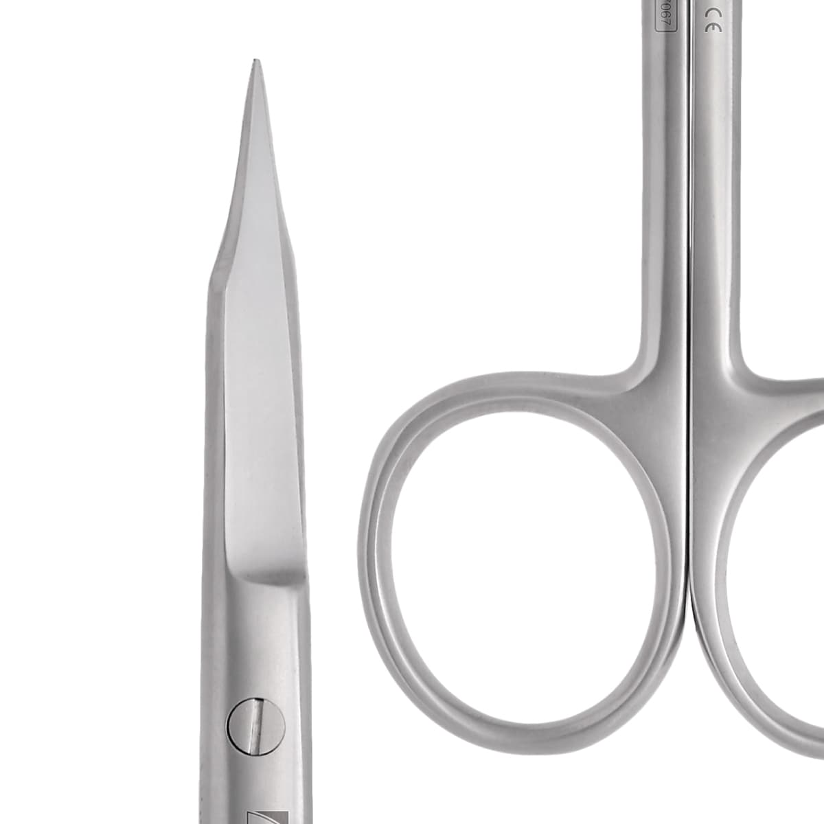 Es una de las tijeras con mango y con anillos con la punta más fina, que permite realizar microcortes de manera sumamente precisa y eficaz. Una de las dos hojas está microdentada y hecha con las mejores tecnologías de fabricación actuales, para garantizar un corte firme y minucioso.